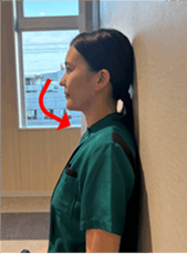 ② 軽く顎を引きます。この際、首の動きは”頷き”程度にして壁から頭は離れないようにしましょう。