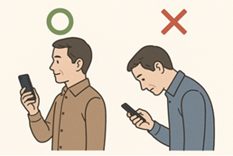頭が前に出てしまう首に悪い姿勢は避けましょう。特にスマホやパソコンを使う際に下を見ながら操作すると頭が前に突き出て首への負担が大きくなります。目線の高さで顎を引くようにして良い姿勢をキープしましょう。