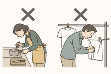 調理や掃除などの前屈みの動作をする際は、長時間下を向かないようにしましょう。
